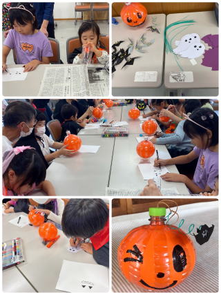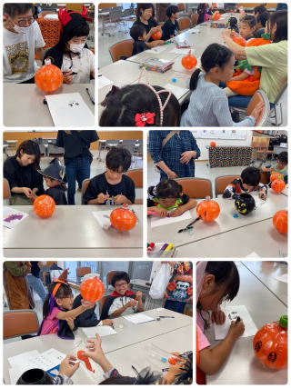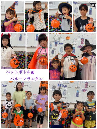 英語紙芝居やハロウィーンキャラクターマッチングゲームなどでハロウィーンに親しみました。お楽しみのクラフトは、「ペットボトル「ランタン作り」。ペットボトルの中に風船を入れて膨らませ、ジャックーオーランタンを作りました。仮装して7カ所のお家を回って、"Trick or Treat!"。たくさんのお菓子と光る指輪をゲットして楽しいハロウィーンタイムでした。