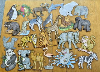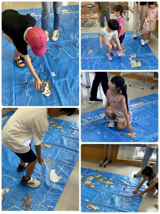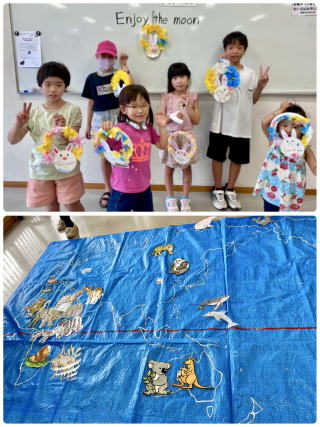 世界中にいるいろいろな動物を英語でいいながら親しんだ後、大きな世界地図(8畳用ブルーシートby ドキターORIO)の上の生育地に、動物をおいていきました。絶滅危惧種や地球温暖化にも触れました。クラフトは紙皿を利用して「お月見リース」を作成、お月見のこと、おつきさまの模様の見え方の違いも面白かったですね。